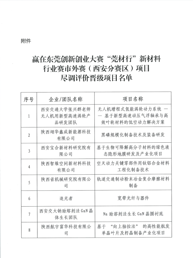 附件:赢在东莞创新创业大赛“莞材行”新材料行业赛市外赛(西安分赛区)项目尽调评价晋级项目名单